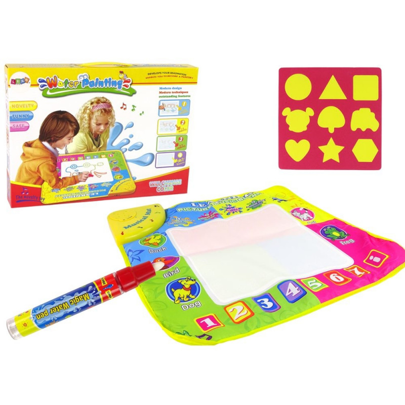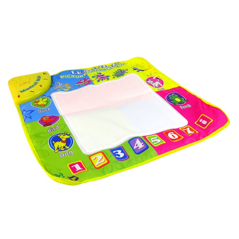 Kogu mati pind on suurepärane mänguväli väikestele kätele. Komplektis on lisaks šabloon erinevate kujundite joonistamiseks ja õppimiseks. Kogu mati ümber on paigutatud loomade sümbolid. Mati ülaosas olevad värvilised “plekid” peidavad endas 5 erinevat muusikakomplekti. Allosas olevad numbrid moodustavad klaviatuuri, millel saab mängida muusikaskaala helisid.