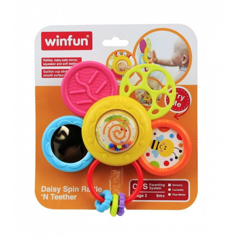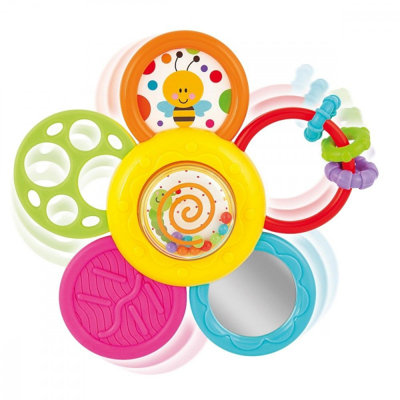 Sellel mänguasjal on palju erinevaid osi: krõbisev mänguasi, närimislelu, turvaline peegel ja vile. Kinnita krõbisev mänguasi siledale pinnale. Laps saab karikakart pöörata, harjutades samal ajal väikseid sõrmi. Pehmed närimisosad rahustavad lapse igemeid. Värvilised ja liikuvad detailid ergutavad last ning toetavad taju ja peenmotoorika arengut.