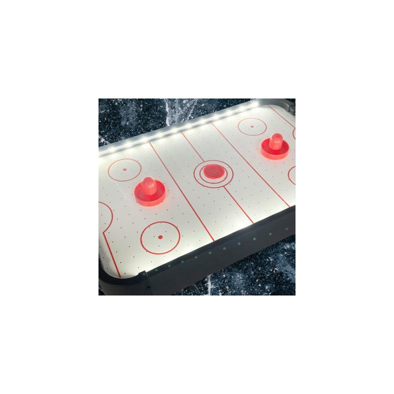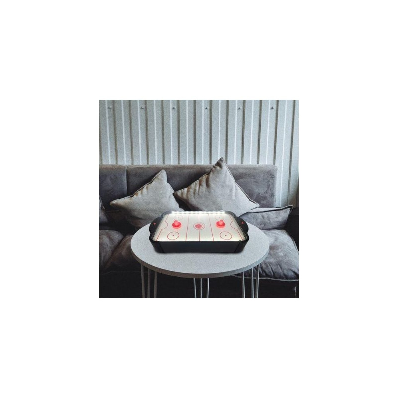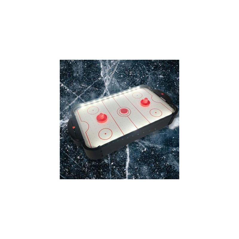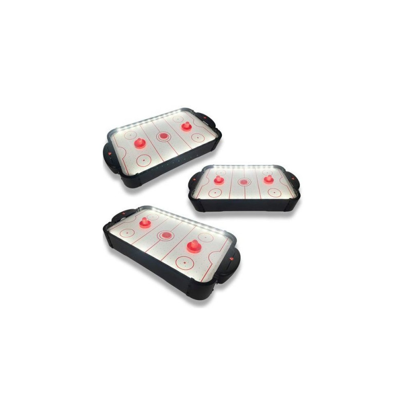 Do you love air hockey but don't have space for a large table? No problem! With the mini air hockey table (which also has LED lights), you can enjoy the fun and excitement of this classic game on any table. Whether in the living room, children's room or office, this compact and lightweight game is easy to set up and store. This table hockey with LED lights features a battery-powered air blower that creates a smooth and fast surface for the pucks. The LED lights on the sides create a cool atmosphere and make the game visible even in the dark. The game comes with two sticks, two pucks and a score counter so you can always keep track of the score. With this air hockey table, you have a great gift for children and adults who like to compete with friends or family. It promotes dexterity, reaction skills and hand-eye coordination. It's also ideal for parties, celebrations or just for fun.Mad Monkey Air Hockey with LED. Product type: Air hockey