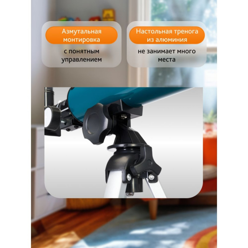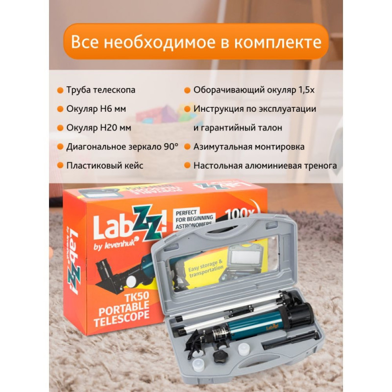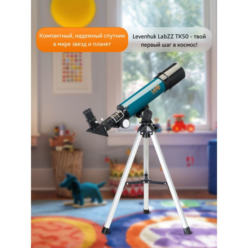 The Levenhuk LabZZ TK50 Telescope is a compact achromatic refractor designed for children. You can use this telescope to view the Moon and terrestrial objects. With this telescope, you can also see some bright stars and planets of the Solar system, but only under ideal conditions (details will be invisible). It is a telescope for lunar observations, which provides a good overview and decent image resolution.