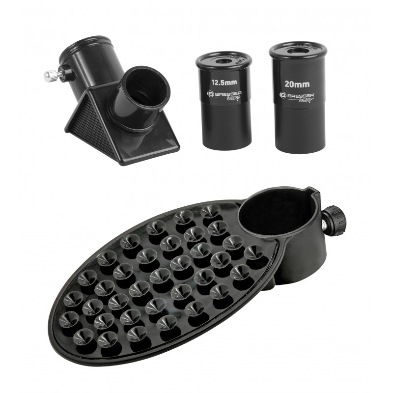 The BRESSER Junior Telescope is ideal for your first astronomical discoveries and is easy to transport thanks to its light weight and compact size. You can conveniently stow the telescope in a small carrying bag or backpack. A table tripod is included so that you can set up the telescope safely anywhere. So that you can use the telescope during the day, it can be converted into a telescope. To do this, simply leave out the star diagonal and the eyepiece. The lens telescope is supplied with two eyepieces and thus enables an optional 20x and 32x magnification through the 12.5 mm and 20 mm eyepiece. With this magnification you can already see impressive moon craters, constellations and rings of Saturn. The telescope also has an integrated compass. With the also supplied star diagonal, you have a comfortable view through the telescope.