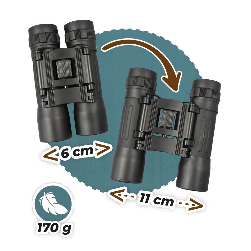 A pair of 10 x 25 mm binoculars for seeing 10 times larger. Focusing ring for clearer images and non-slip coating for a solid grip. Tinted lenses for more natural colours. The binoculars are compact and lightweight. Carrying pouch and cleaning cloth included. Illustrated colour instructions with experiments and observations. Age From 8 years old