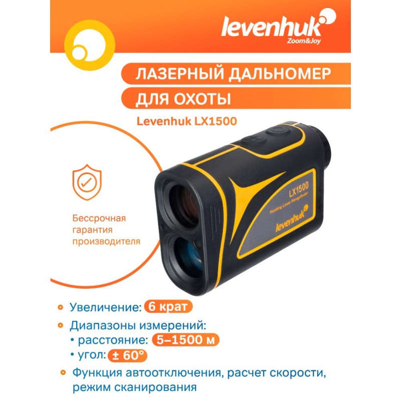 Levenhuk LX1500 is a laser rangefinder for hunting, sports and tactical games, hiking, and any situation where you need to measure the distance, angles, and speed in open spaces. You can measure the distance of 5 to 1,500 meters (16–4,900ft). The device is very compact and lightweight and it is easy to hold it in your hands. There is also an option to mount it on a tripod in case you want to get more stable images. It is also possible to use the device as a standard monocular with 6x magnification.