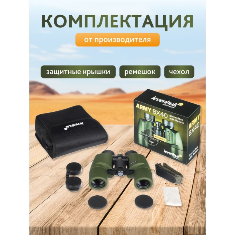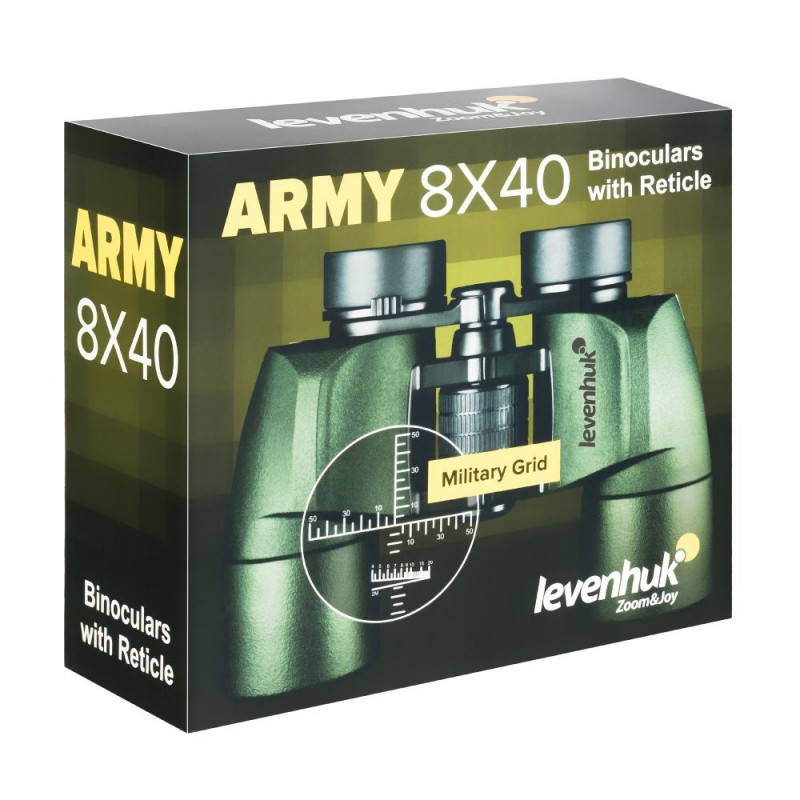 Levenhuk Army 8x40 with reticle – simple field binoculars that are suitable for use even in harsh weather conditions. It is a real find for hunting and fishing, tactical observation, and extreme sports. One of the binoculars' eyepieces has a scaled reticle and a range-finding scale to help you measure the distance to the object you are looking at as well as its height and angles. Thanks to the wide field of view, you can look over a wide area and observe people, animals, or vehicles.
