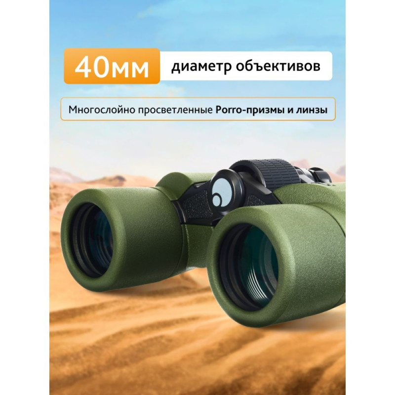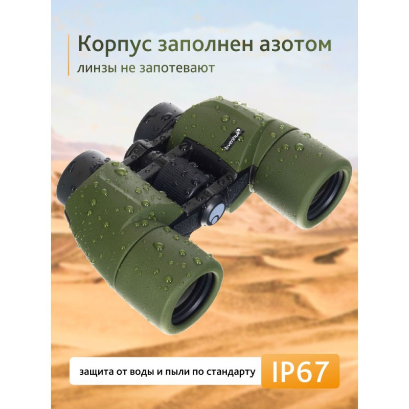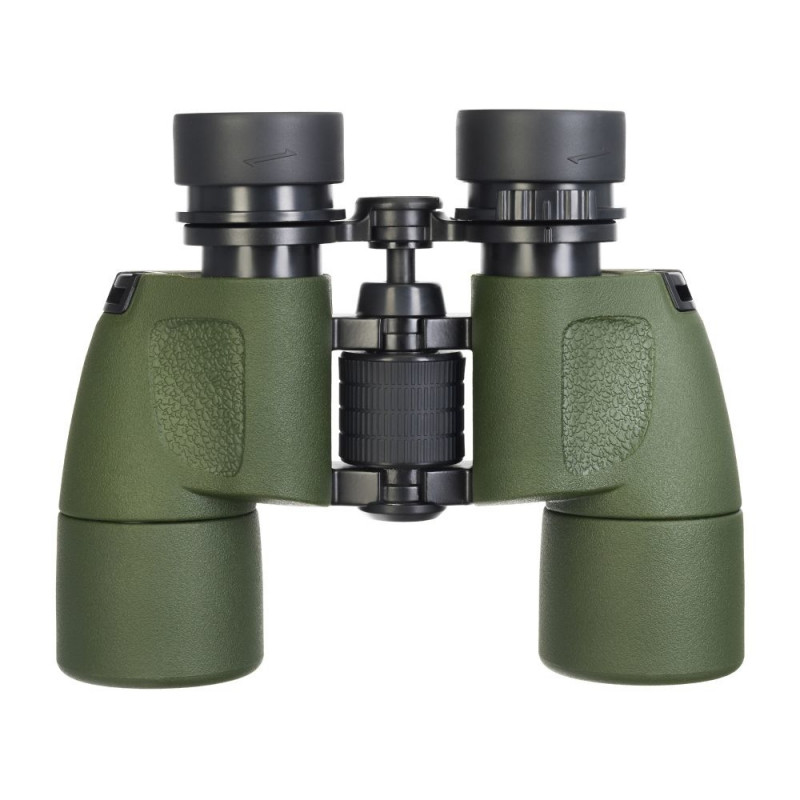 The optics of the Levenhuk Army 8x40 binoculars are based on full-size Porro prisms and deliver bright, saturated, and clear images. The high quality BaK-4 glass is fully multi-coated that improves the contrast and clarity of the image. You can focus not only on distant targets, but also on objects that are only 3 meters (10ft) away from you. The large embossed central focusing wheel adjusts the sharpness. Twist-up eyecups and diopter adjustment make it easy to adjust binoculars for your eyes.