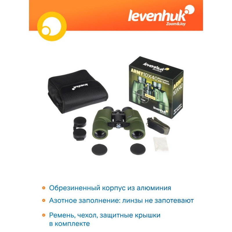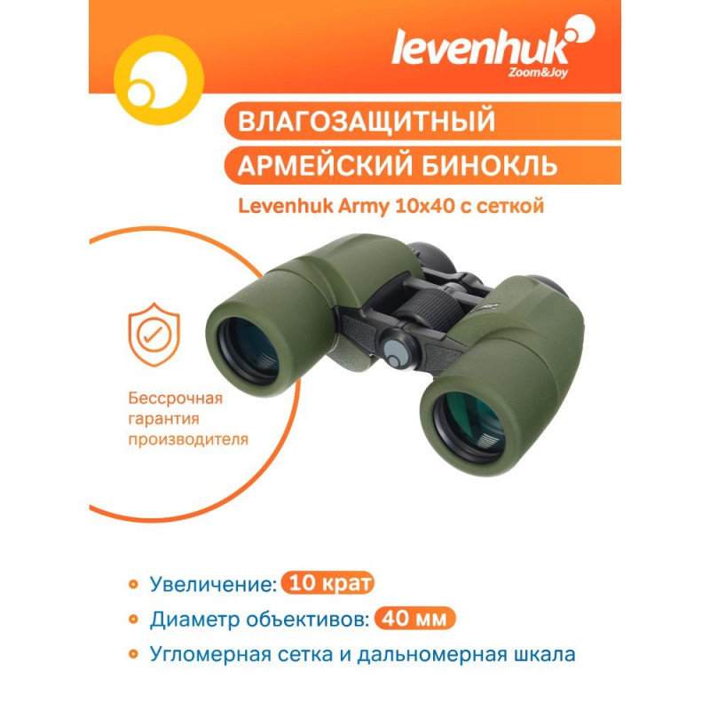 Introducing Levenhuk Army 10x40 – field binoculars with scales that are great for hunting, extreme tourism, tactical and security purposes, and surveying. The device can be used not only to explore the area and locate distant targets at 10x magnification, but also to make a number of measurements: distances and heights as well as horizontal and vertical angles. It is possible thanks to the scaled reticle and range-finding scale in one of the binoculars' eyepieces.