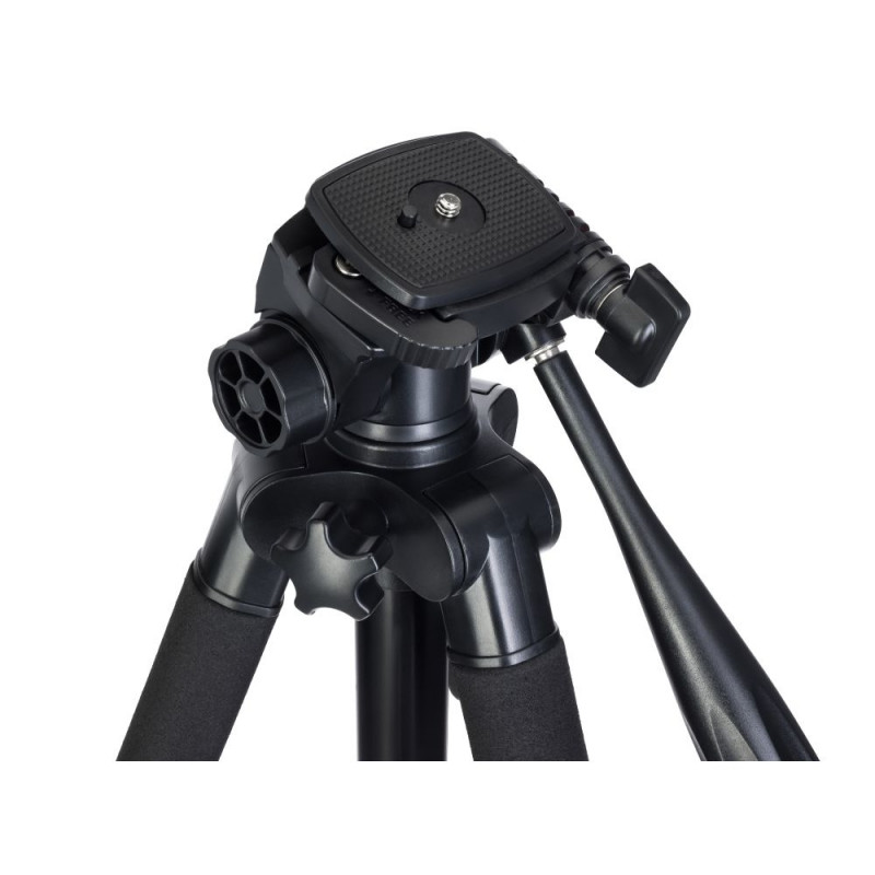 The head rotates 360° horizontally around its axis and tilts forward and backward, while the lock can tilt sideways up to 90°, enabling you to find a perfect angle for your device. In addition, the center column of the tripod can optionally be used as a monopod. The quick release plate makes it easy to set up and change devices on the tripod.