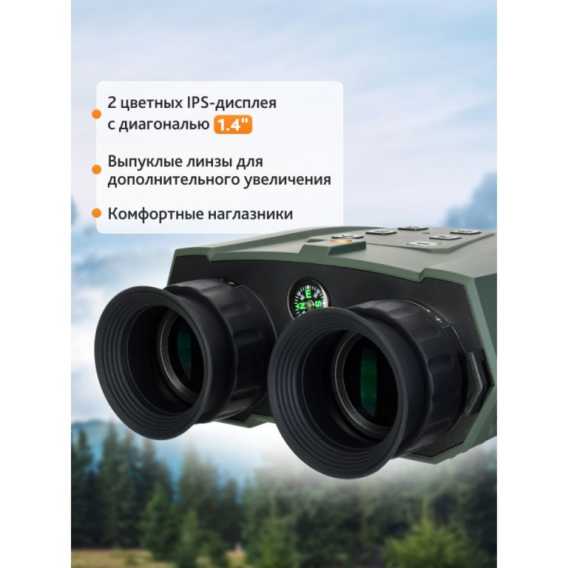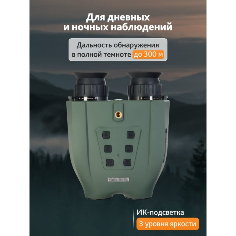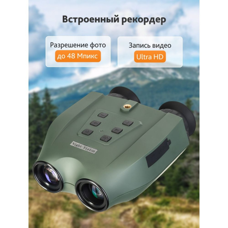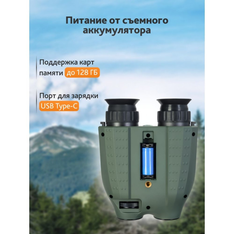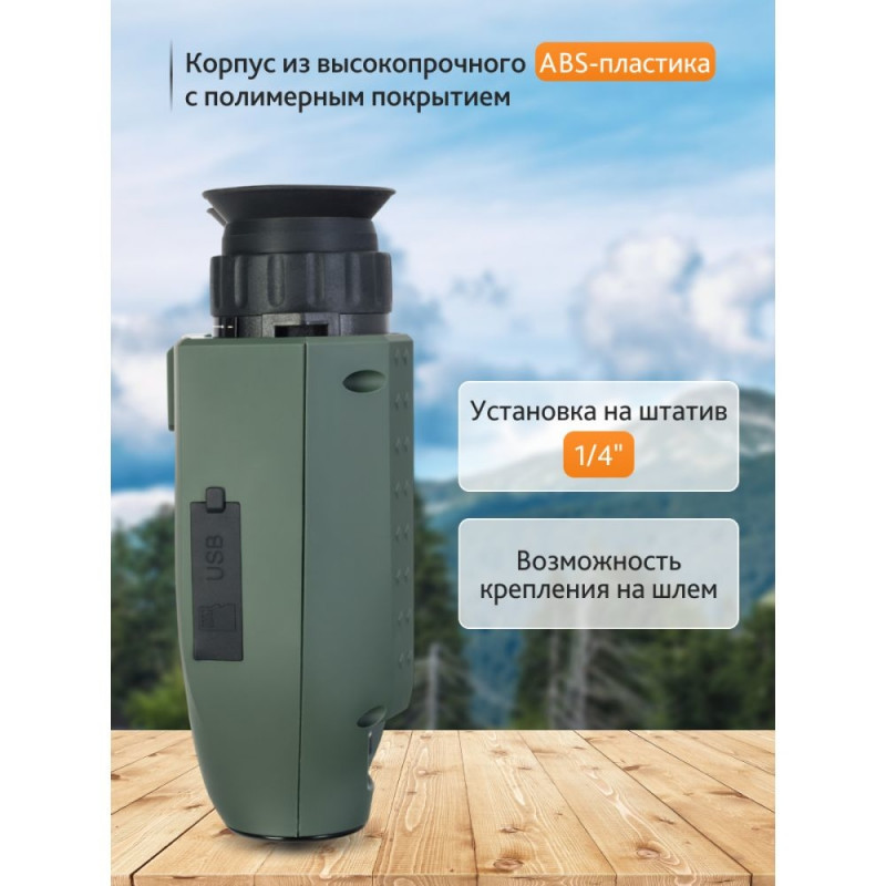 Thanks to the lightweight and durable ABS plastic body, these binoculars are convenient for long-term transport and mobile observations. The polymer coating of the body increases damage resistance and provides a reliable grip. The device is powered by the included and removable 700mAh battery. The operating time with a fully charged battery is up to 2 hours at night (with activated IR illumination) and up to 10 hours during the day. The battery can be charged using the included USB cable or from the AC power supply (you need to purchase an adapter). The NVD can be used handheld, mounted on a tripod, or mounted on a helmet.