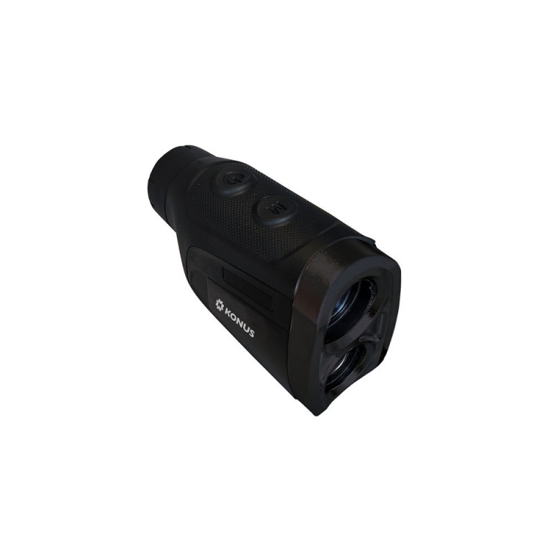 The Konus RF-1200 is a tough, compact rangefinder with 6x zoom and up to 1200 m range. It measures slope and speed, works in bad weather, and fits great in hand. Comes with battery, case, wrist strap, and cleaning cloth.
