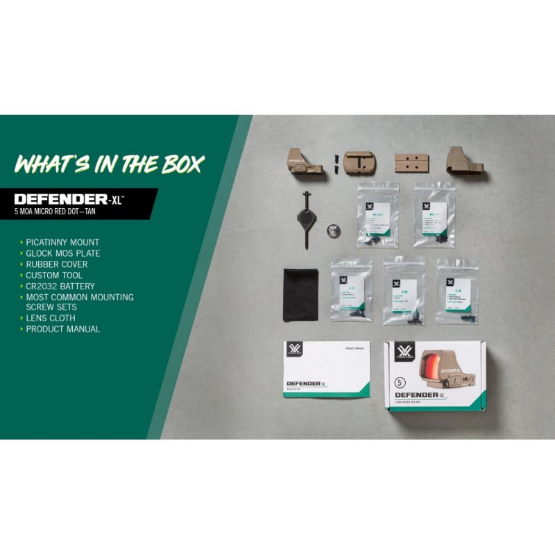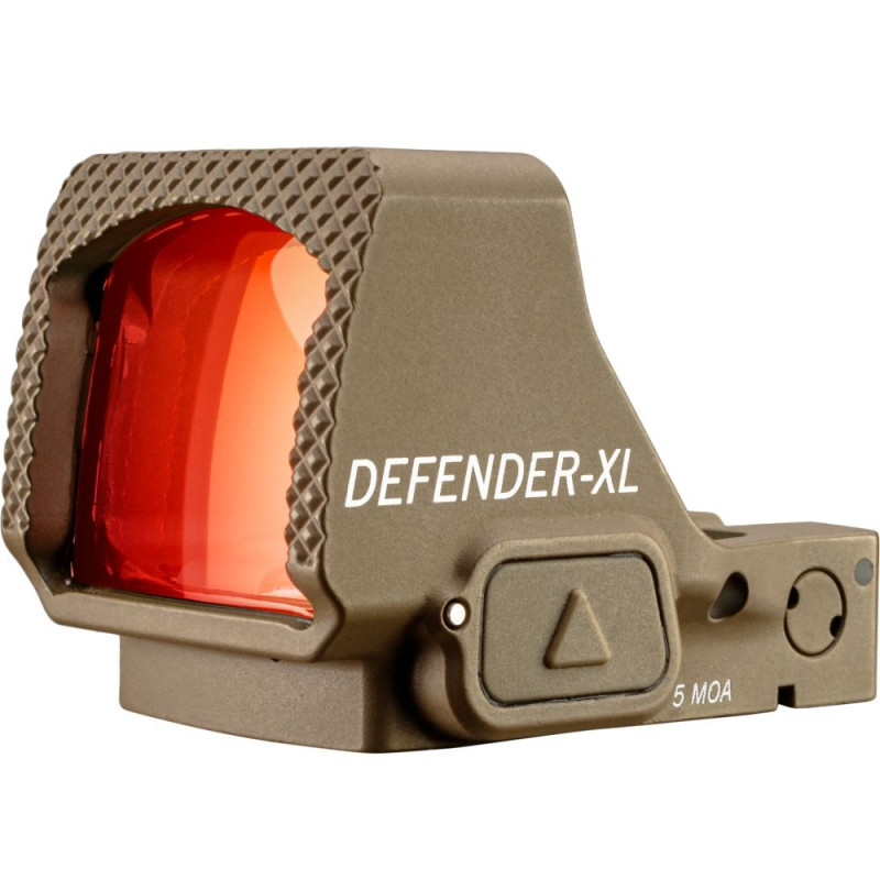 The Vortex Micro Red Dot Defender-XL 5 MOA (Tan): ultra-wide window, lightning response, 12 brightness levels (2 NV), waterproof, ShockShield, easy battery swap, RMS adapter and lifetime VIP warranty.