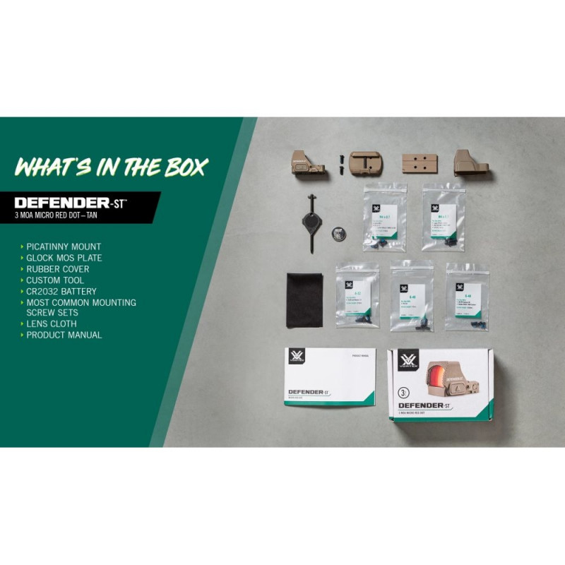 **Olulisemad omadused – Vortex Micro Red Dot Defender-ST 3 MOA Tan**- Asfääriline kõvapinnaga lääts: tagab ereda, terava ja moonutustevaba pildi — isegi tugevas päikesevalguses