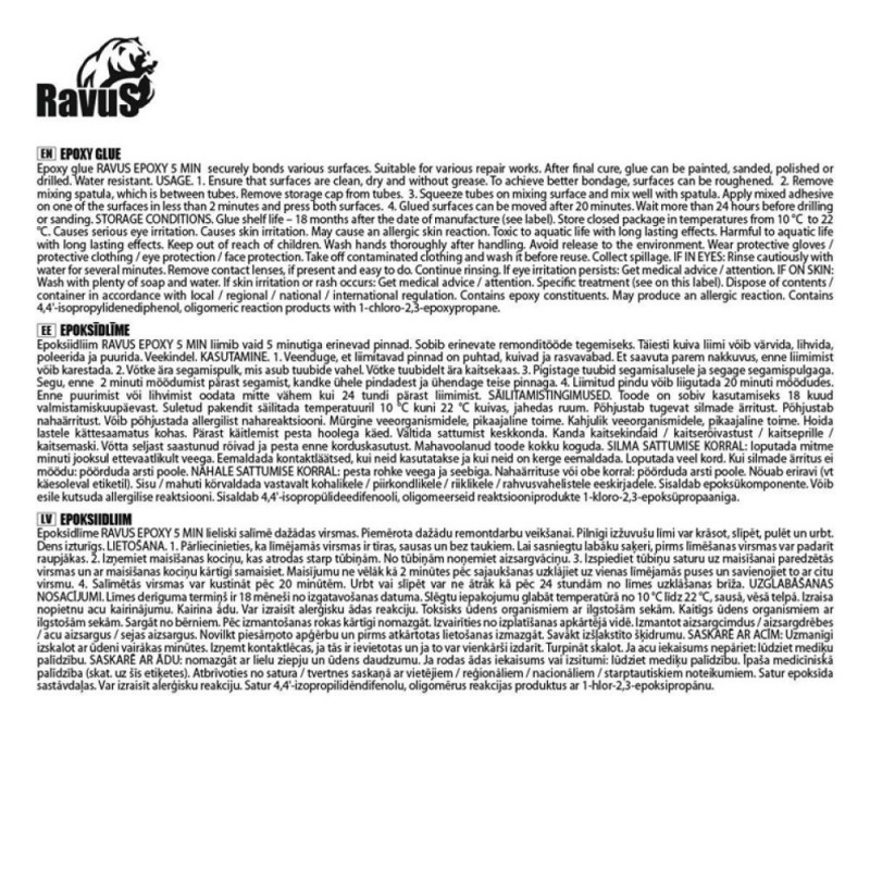 See kiiretoimeline liim seob pinnad tugevalt ja püsivalt vaid 5 minutiga. RAVUS EPOXY 5 MIN on vastupidav veele, õlile, kemikaalidele ja temperatuurimuutustele, mistõttu sobib see ideaalselt nii sise- kui välistingimustes kasutamiseks.