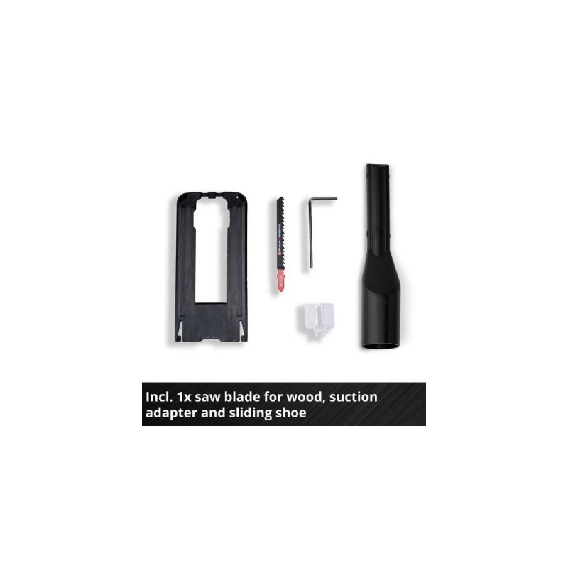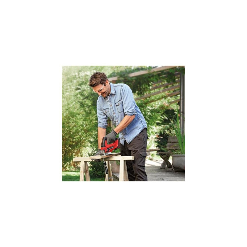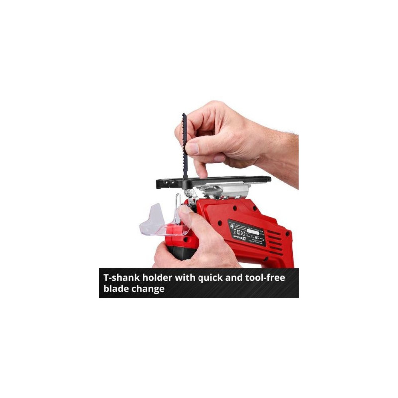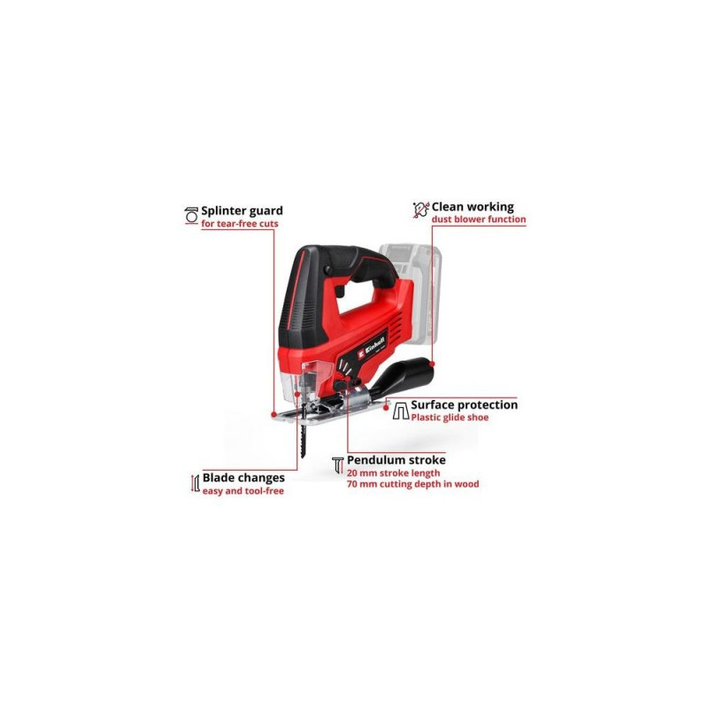 The Einhell TC-JS 18 Li cordless jigsaw is always ready to hand when it comes to the perfect cut in a wide range of materials. As a member of the Power X-Change family it offers great flexibility for jobs in the home, workshed and garage. Cordless freedom with concentrated rechargeable battery power: The rechargeable batteries from the Einhell system family can be used in all PXC devices. Thanks to really smooth operation, the cordless jigsaw delivers exact cuts. For fast cuts it has a selectable pendulum action. The universal blade holder without tools saves unnecessary hand movements, enabling the blade to be changed quickly and without the need for any tools. For optimum visibility while working there is a dust blow-off function. The integrated plastic sliding element protects particularly sensitive workpieces. The product is supplied complete with a KWB quality saw blade for wood. This product comes without a battery or charger. These are available separately, for example as a practical Einhell starter set.Einhell TC-JS 18 Li - Solo. Handle type: Top handle, Product colour: Black, Red, Bevel capacity (max): 45°. Idle stroke rate (max): 2700 spm, Cutting depth in wood: 7 cm, Cutting depth in steel: 8 mm. Power source: Battery, Battery technology: Lithium-Ion (Li-Ion), Battery voltage: 18 V. Weight: 1.62 kg, Width: 75 mm, Depth: 196 mm. Package type: Box