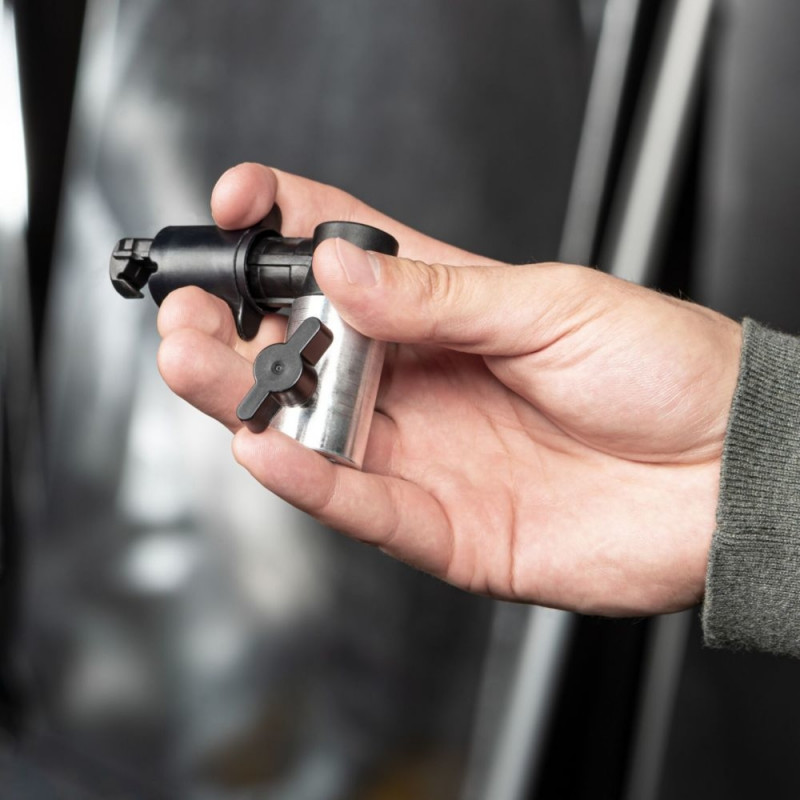 Thanks to the one-hand operation, it is possible for a single person to hold the background and at the same time fix it very easily with this clamp. The handling is very simple and allows flexible positioning. Textile backgrounds can thus also be stretched without a crossbar.