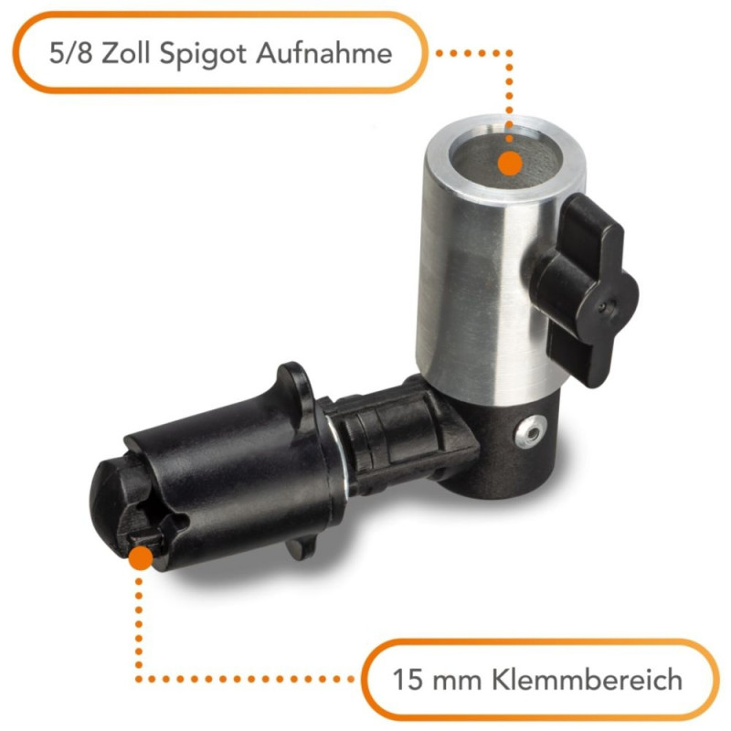 With this practical holder, various backgrounds, folding reflectors or decorative elements can be attached to lamp tripods. Ideal for all those who work alone in the studio or on location and therefore do not have a free hand. Thanks to the 5/8 inch aluminium spigot connection, this holder fits all common lamp tripods.