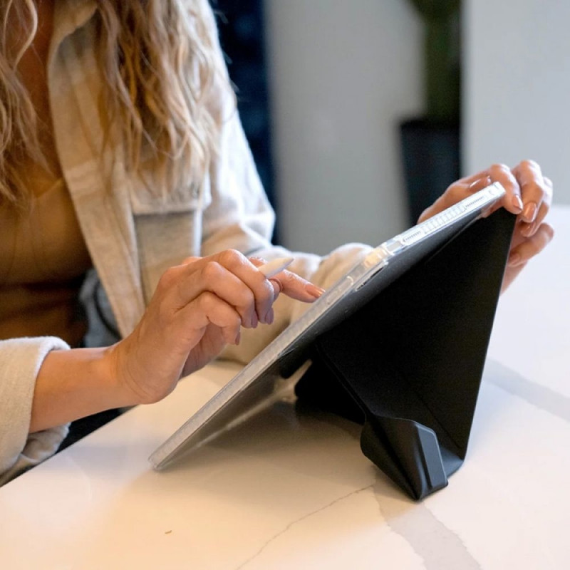 Etui STM do iPada zostało wyposażone w magnetyczną okładkę origami na ekran z opatentowanym zamknięciem oraz uchwyt na rysik Apple Pencil, który można przechowywać bezpośrednio w pokrowcu OPP.