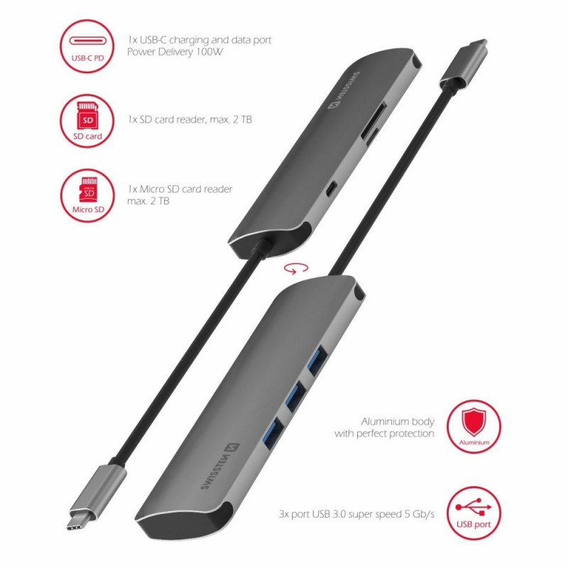 Swissten USB-C Hub 6in1 with 3X USB 3.0 / 1X USB-C Power Delivery / 1X microSD / 1X SD / Aluminum bo