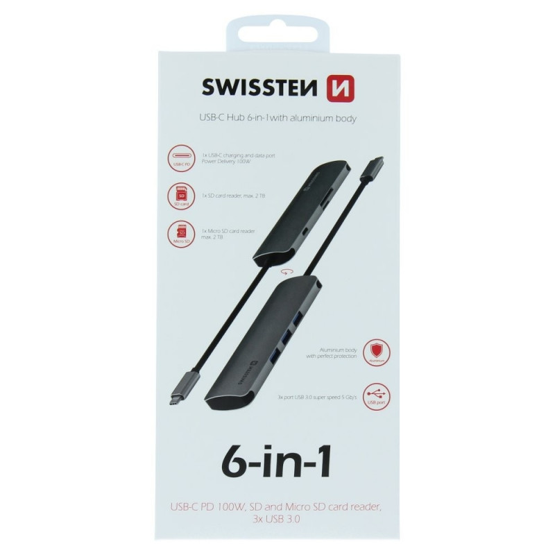 Aluminum USB-C HUB Swissten 6in1 with 3 USB 3.0 outputs with a transfer speed of 5G / s. Packed in a Swissten blister.