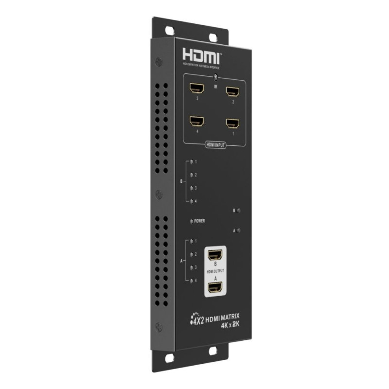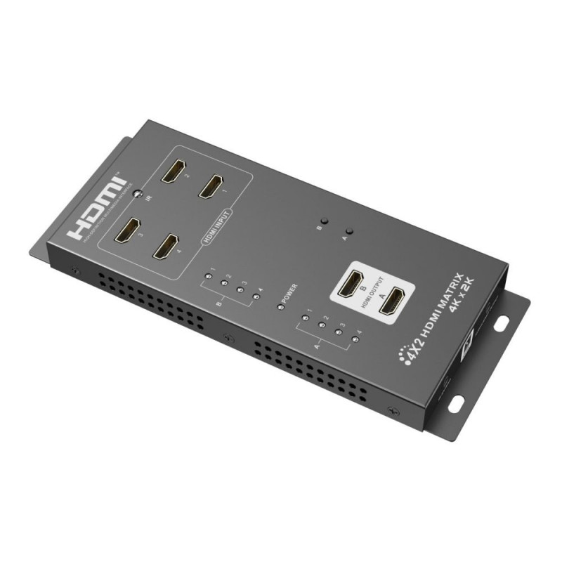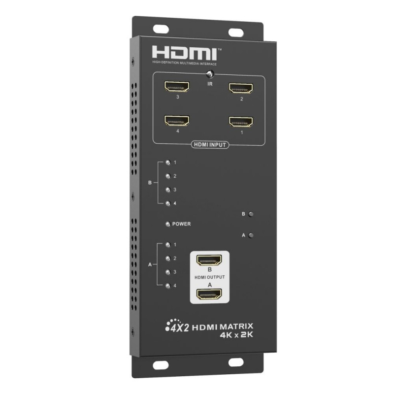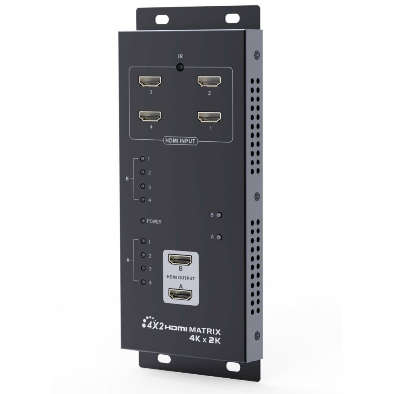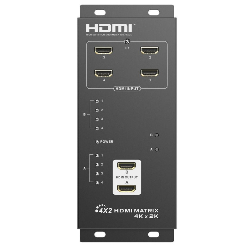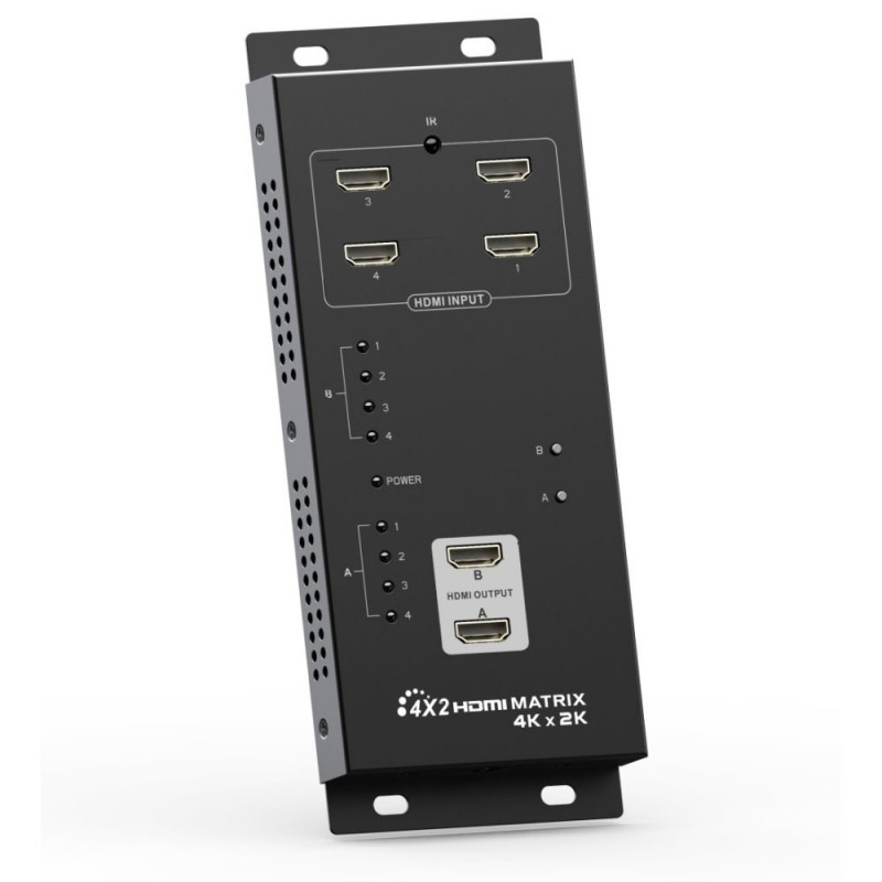 PremiumCord HDMI matrix switch 4:2 with audio, resolution 4Kx2Kv30Hz It accesses to 4 HDMI sinks with stereo audio output, using 4 HDMI sources .The matrix allows 4 HDMI devices to be switched or split to 2 HDMIcompatible monitors or projectors. Each oWarning: Last items in stock!
