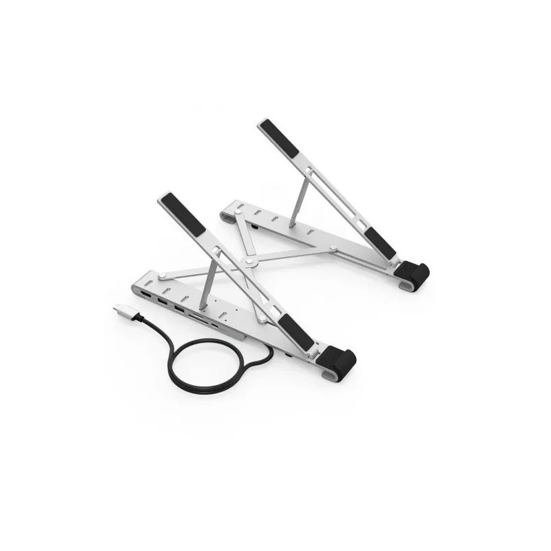 Features: Notebook stand and 7-port USB-C 3.0 hub in one. Get 7 essential ports for your laptop: HDMI 4K port allows you to connect an additional monitor, HDTV or projector, USB Type-A and Type-C interfaces connect keyboard, mouse, phone, external data storage like USB flash drive or SSD. USB Type-C PD 3.0 port supports power delivery up to 100W. Supports fast data transfer up to 5Gbps via USB-A/USB-C ports and up to 104Mbps via TF and SD card slots. The desktop laptop stand is designed for 10-17" laptops and tablets, foldable, lightweight and perfectly portable. 5 different positions allow you to adjust your laptop from 15 to 36 degrees based on personal preferences. Suitable for Chromebook, Windows PC, MacBook, iPad Pro, etc. Stand features a high-grade silicon layer of cushioning to ensure your laptop is securely in place. Our ultra-thin aluminum frame helps to provide optimized airflow to the underside vents of your computer, such protecting your laptop from common overheating problems. Comes with a handy fabric carrying case.