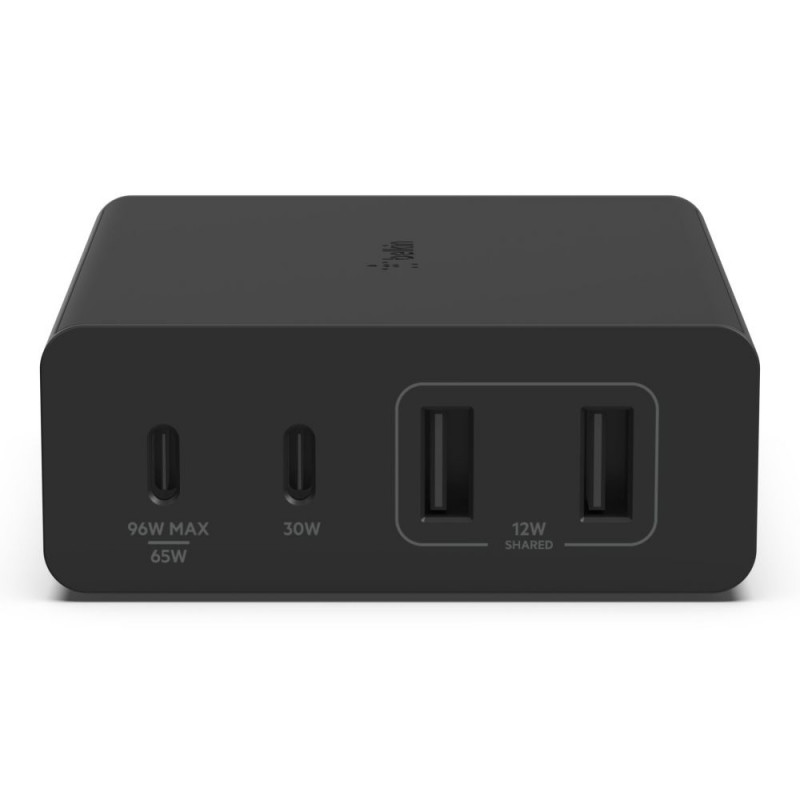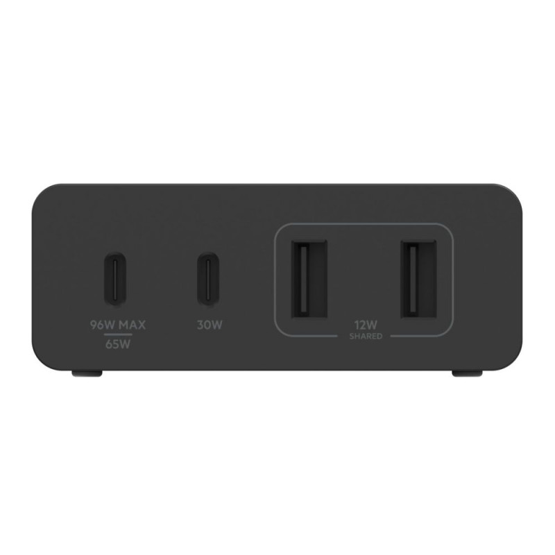 - 4-port GaN charger with 2x USB-C and 2x USB-A ports.