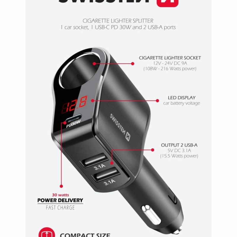Swissten Car charger 1x USB-C PD / 2x USB-A / CL / LED