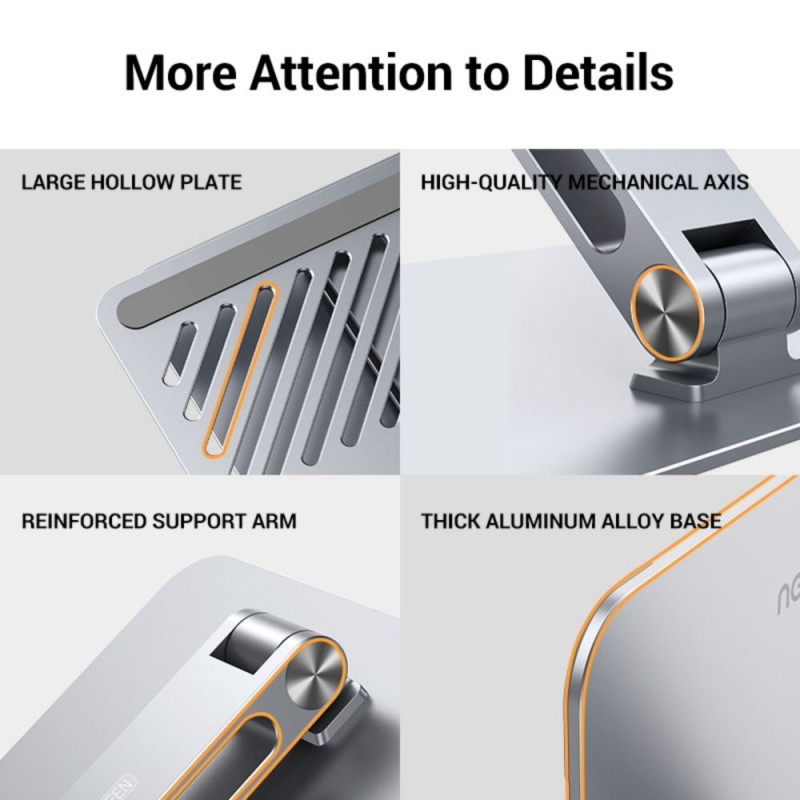 The foldable laptop stand is made of high-quality aluminum alloy with smooth edges to protect your device from scratches. An extremely sturdy and durable silicone pad ensures a close connection with the work surface so that your laptop stands securely without wobbling or slipping.
