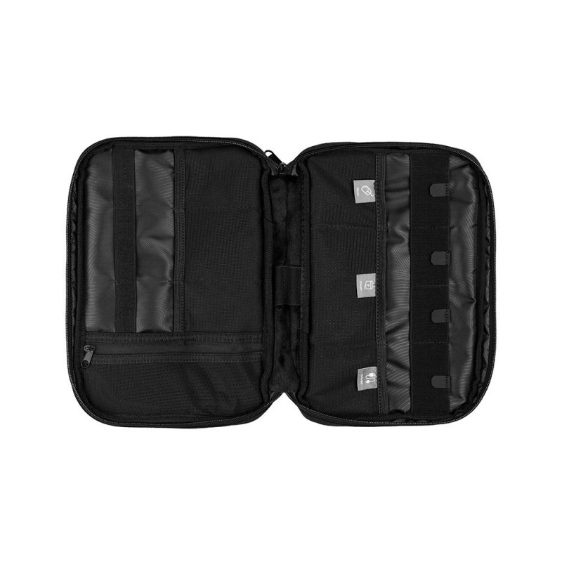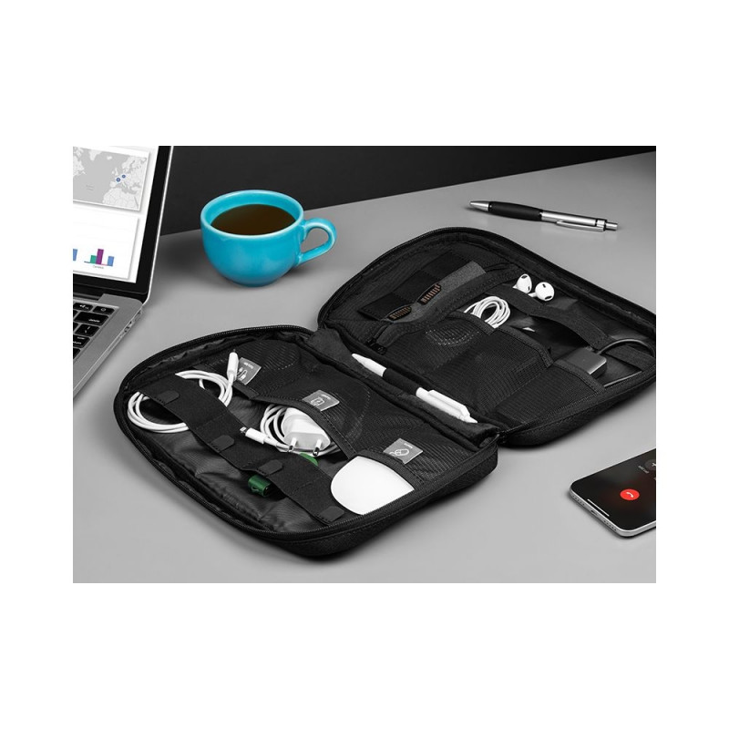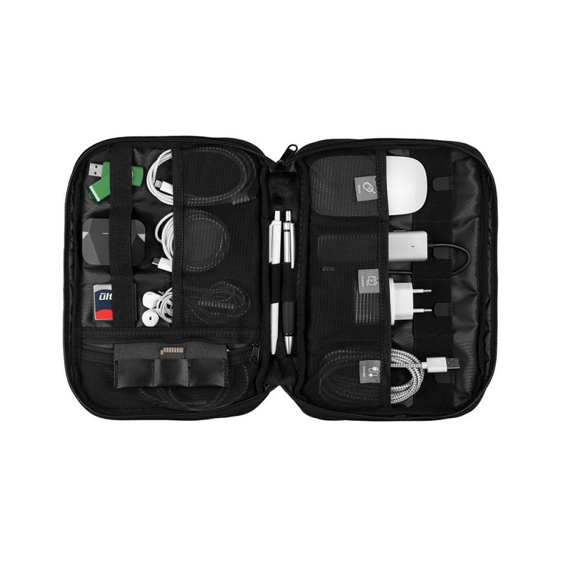 -1 x zamykana na suwak kieszeń zewnętrzna, siateczkowe przegródki/dedykowane miejsca na ładowarkę, stylus do tabletu, mysz, przewody, karty pamięci, gumowe elastyczne taśmy wewnętrzne