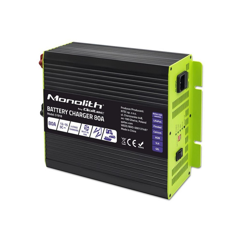 Qoltec Smart Professional Monolith Battery Charger for LiFePO4 AGM GEL SLA batteries | 80A | 12V | F