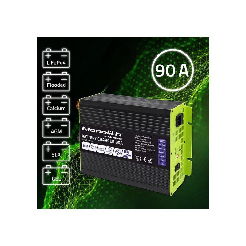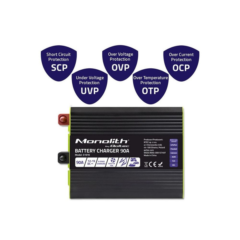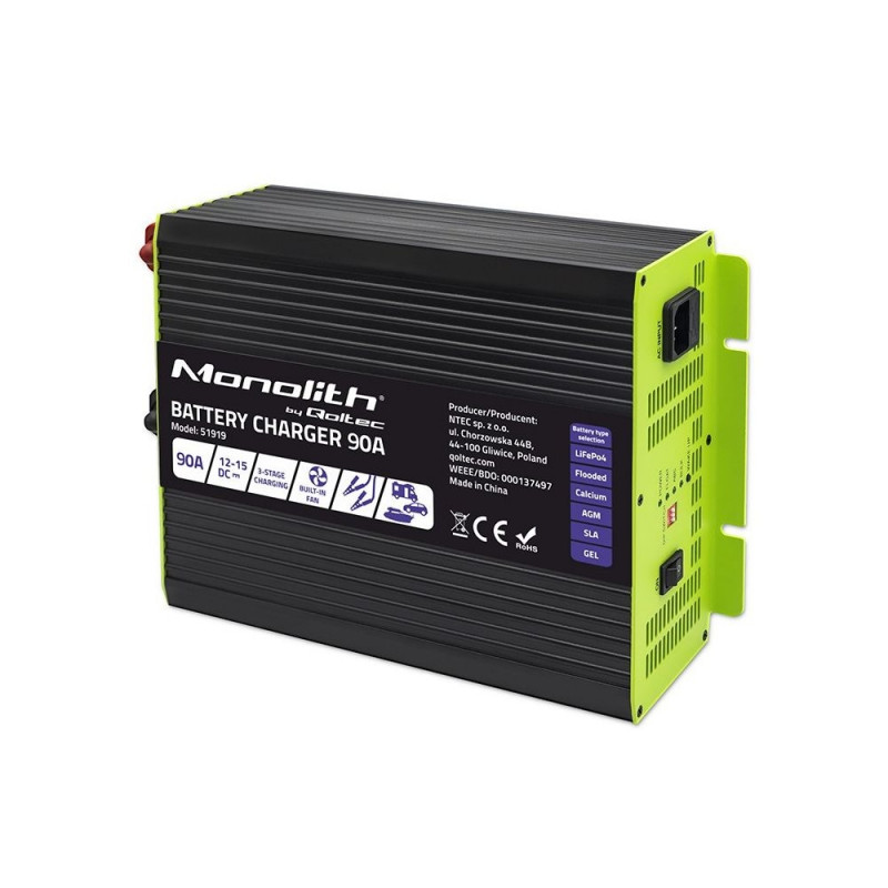 Qoltec Smart Professional Monolith Battery Charger for LiFePO4 AGM GEL SLA batteries | 90A | 12V | F