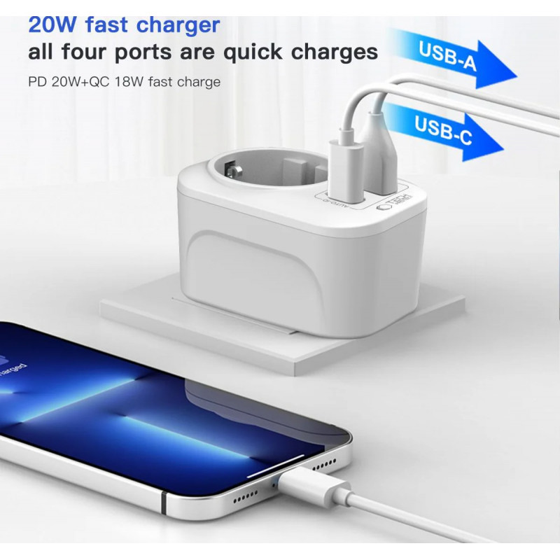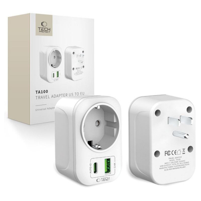 The adapter supports an input voltage of 100-250 V (50-60 Hz) and a maximum output power of up to 2500 W, suitable for using both smaller electronic devices and devices with higher power consumption. In addition, the TA100 is equipped with USB-A and USB-C outputs (5 V / 2.4 A), which allow for fast charging of smartphones, tablets, cameras and power banks.