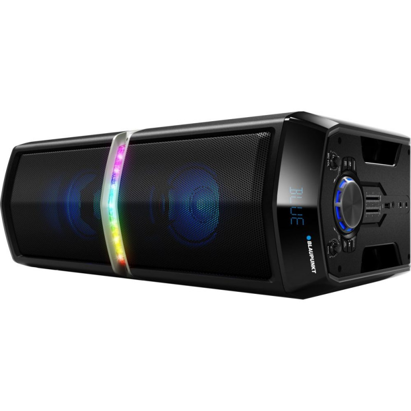 Audio streaming via Bluetooth (A2DP profile) USB player MP3/WMA playback FM tuner with 40 station memory preset Equalizer: Rock, classic, jazz, dance Karaoke function with microphone included Remote control AUX-In LED display Disco LED lights Peak power: 800 W Power supply: AC 100-240 V ~ 50/60 Hz Battery power: rechargeable battery 12 V 4000 mAh Battery operation: 3 h Charging time: 3 h Dimensions: 210 (W) x 610 (H) x 300 (D) mm Weight: 7.5 kg