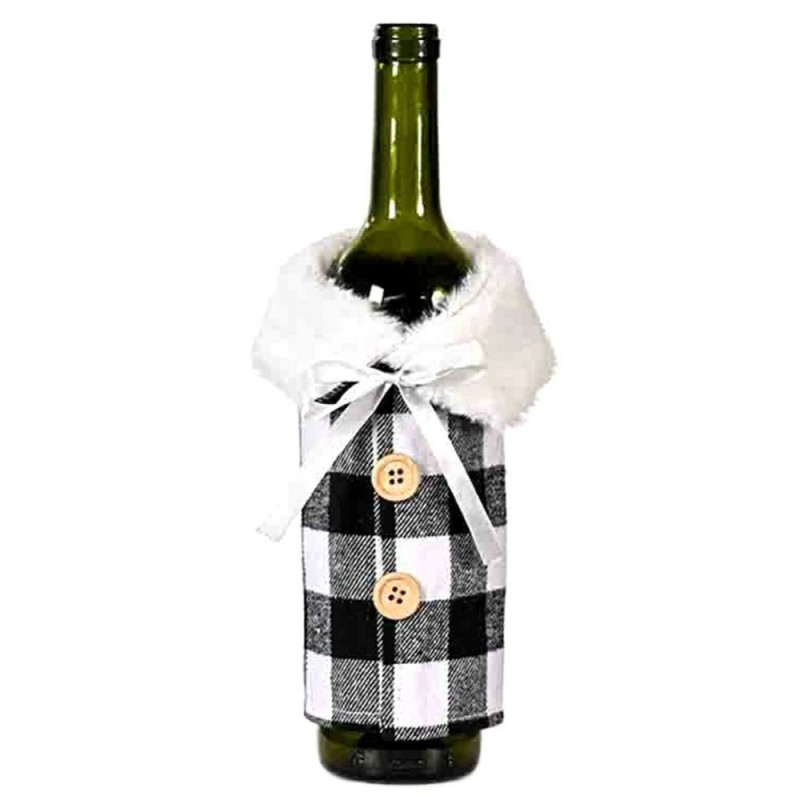 Pokrowiec na butelkę w kształcie sweterka z wzorem w kratę. Doskonały pomysł na ozdobienie butelki z winem lub szampanem. Świetnie sprawdzi się jako dekoracja świąteczna. Estetyczne futerko w górnej części pokrowca.