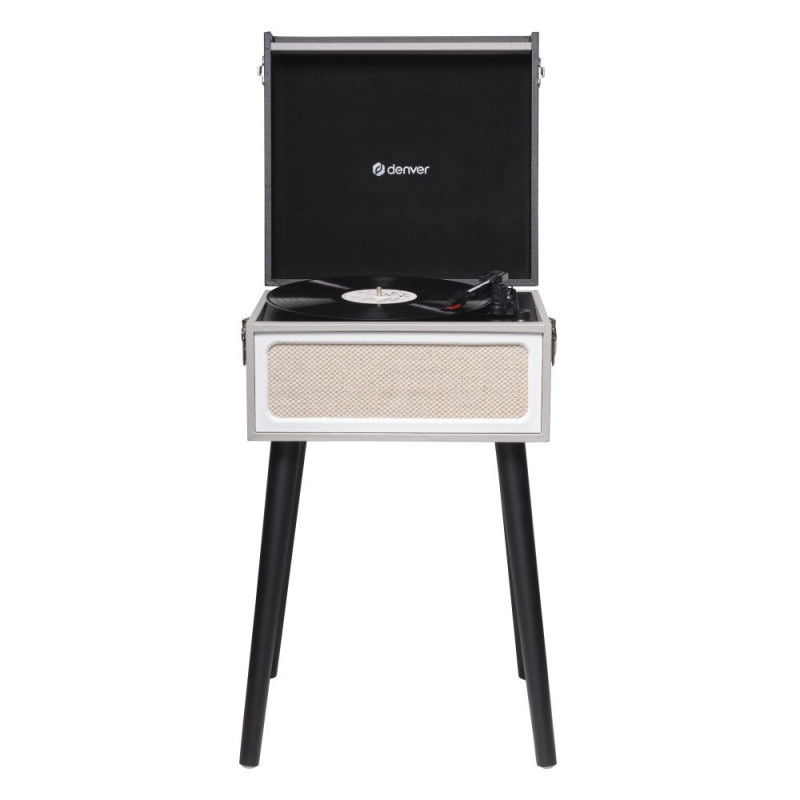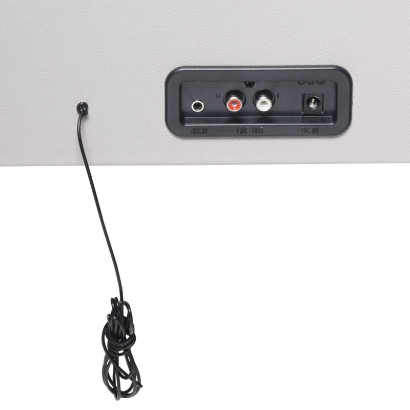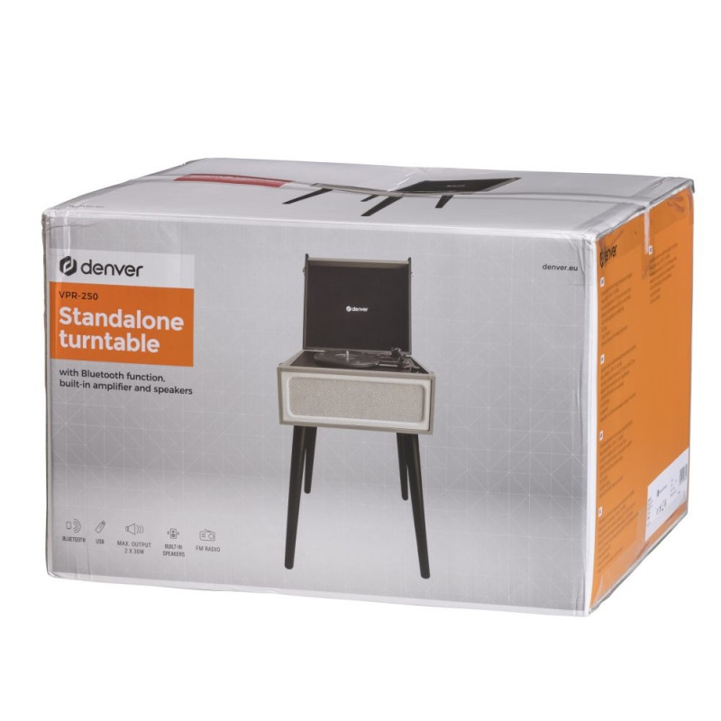 Features Standalone turntable with built-in amplifier and speakers 2 x 30W Max power output (2 x 3W RMS) Can play 33 1/3rpm, 45rpm or 78rpm vinyl records Bluetooth 4.0 for audio streaming from e.g. smartphone USB for MP3 playback & encoding FM stereo radio Connections: Bluetooth function, USB input, RCA output, Headphone jack Retro looks with suitcase design and black legs Materials: Wooden legs and cabinet Power suppply: 230V~50Hz AC/DC adaptor