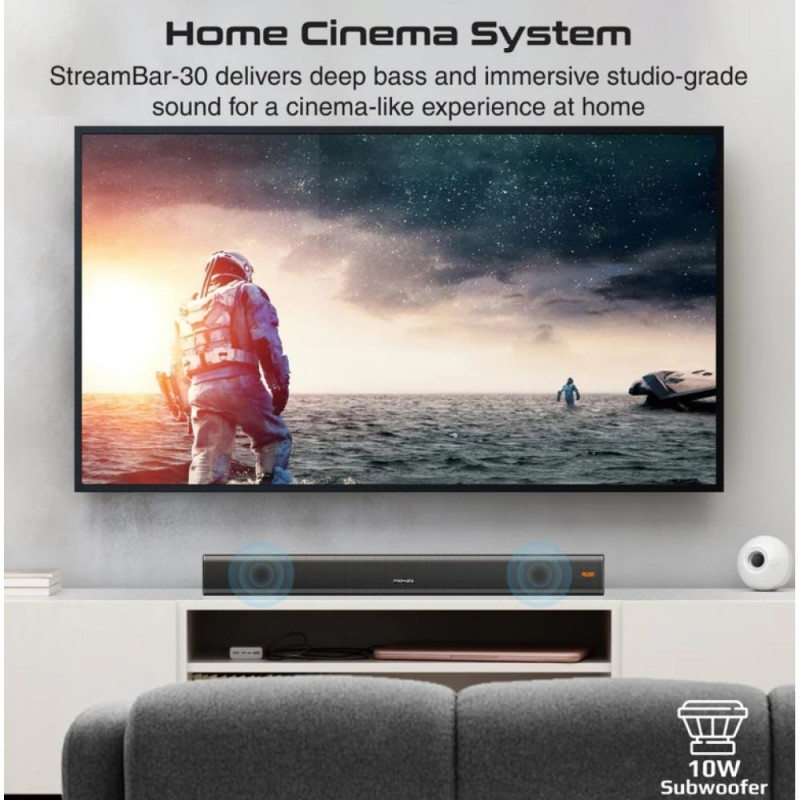 Home Cinema System With a built-in 10W Subwoofer, StreamBar-30 delivers deep bass and immersive studio-grade sound for a cinema-like experience at home. High Definition 30W Sound Hear everything with precise detail with the powerful, stellar sound-prWarning: Last items in stock!