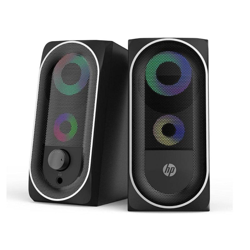 High-quality HP stereo speakers deliver clear and crisp sound. Powered by USB, they don't require an external power source and feature RGB lighting for an enhanced visual experience. Features High-quality speakers provide clear, crisp sound. PoweredWarning: Last items in stock!