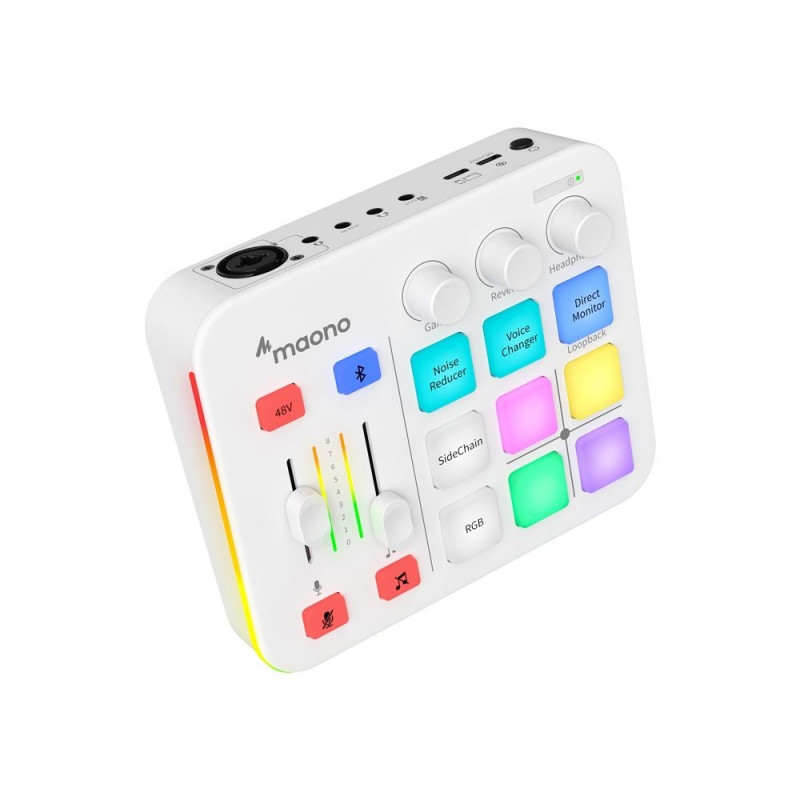 The Maono G1 Neo is a versatile sound card that will enhance the quality of your broadcasts and recordings with professional sound, intuitive control and striking RGB lighting. The compact design makes it easy to fit on your desk, and the XLR input allows for quick microphone installation.