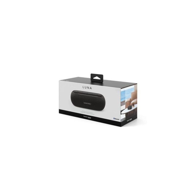 <b>HARMAN KARDON SUPERIOR SOUND</b><br>Hear every detail of your music with balanced, high-quality audio from the advanced drivers of the Harman Kardon Luna's 2-way speaker system. The iconic Harman Kardon sound will make your favorite songs sound brand new.<br><br><b>STYLISH LOOKS, QUALITY DESIGN</b><br>The Harman Kardon Luna's sleek, minimalist silhouette enhances any setting. The elegant ergonomic design, fabric-encased build, and anodized aluminum top panel look and feel great anywhere.<br><br><b>BUILT-IN BATTERY</b><br>Never miss a moment of your favorite song or podcast. Packing 12 hours of built-in battery life, the Harman Kardon Luna is the perfect all-day companion to power your personal soundtrack.<br><br><b>Never leave your music behind</b><br>Indoors or out, set your vibe with dynamic audio from the Harman Kardon Luna. Engage with superior sound and powerful bass from a compact Bluetooth speaker.<br><br>You’ll be tempted to pick it up just to feel the soft grille fabric and quality anodized aluminum accents. The elegant silhouette fits so perfectly in your hand that you’ll carry it from brewing your morning cup of tea in the kitchen into your home office for an all-day focus playlist. Then later, how about unwinding on the couch with your favorite podcast?<br><br>With an IP67 waterproof and dustproof rating and 12 hours of built-in battery life, the Harman Kardon Luna keeps up when the backyard cookout becomes drinks around the firepit. If you'd like even more amazing audio, you can wirelessly pair two Harman Kardon Lunas together for enhanced stereo sound.Harman/Kardon Luna. Speaker type: 2-way, Tweeter diameter: 2 cm. RMS rated power: 25 W, Frequency range: 60 - 20000 Hz, Signal-to-Noise Ratio (SNR): 80 dB. Connectivity technology: Wireless, Frequency range: 2.4 - 2.483 GHz, Bluetooth profiles: A2DP, AVRCP. Product type: Stereo portable speaker, Product colour: Black, Protection features: Waterproof. Recommended usage: Universal