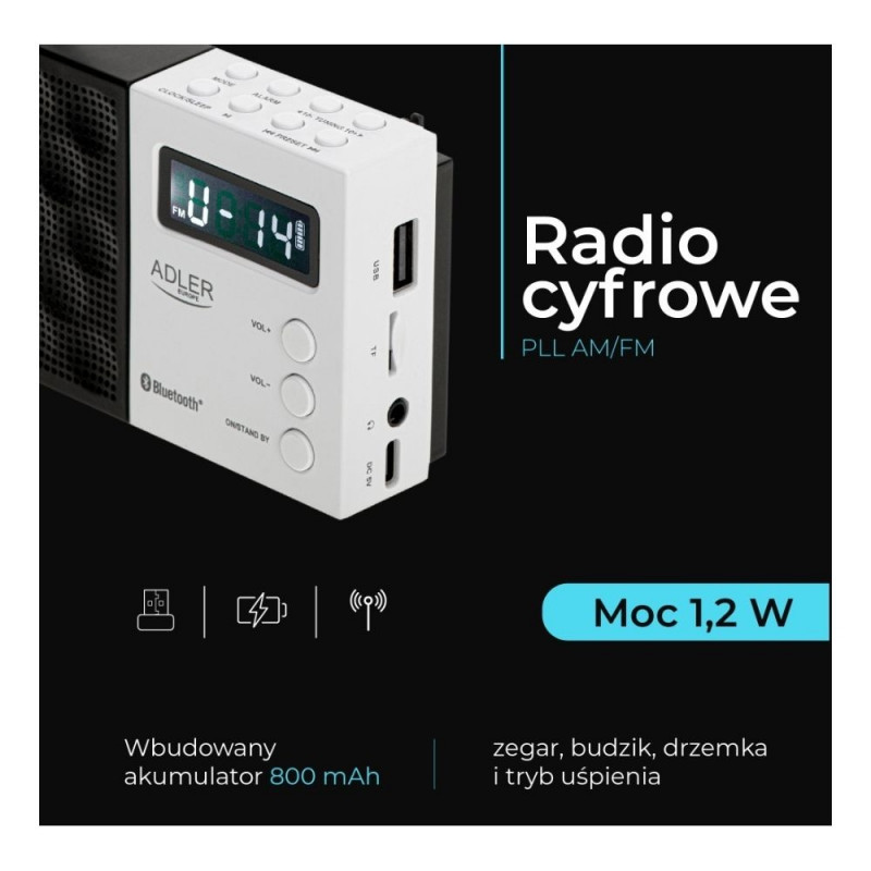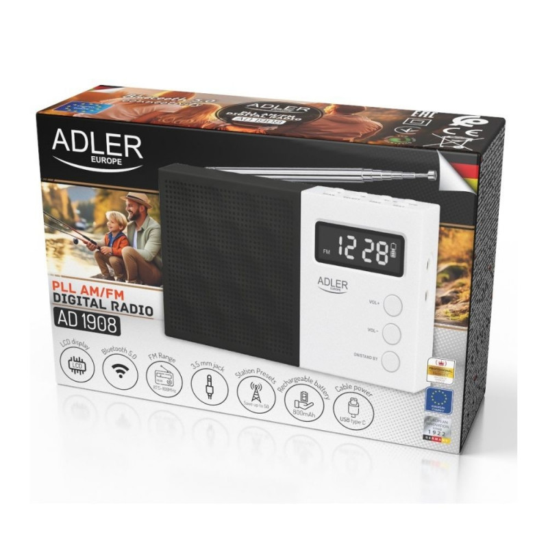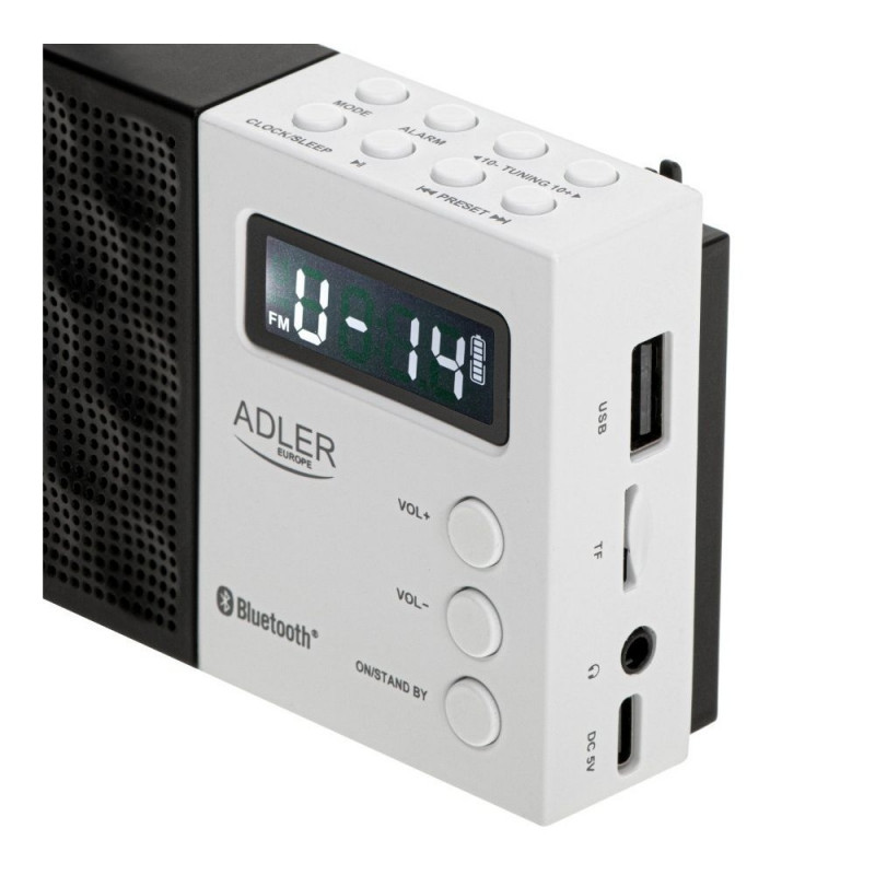 The Adler AD 1908 is a modern PLL AM/FM digital radio that combines classic radio functionality with advanced features such as Bluetooth 5.0 and playback from USB/SD media. With a wide FM frequency range, the ability to save favorite stations, and a multifunctional LCD display, this radio delivers convenience and high-quality sound.