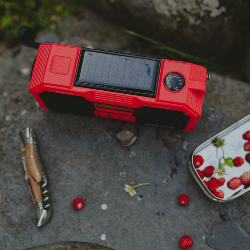 The DR 112 is a solar and crank radio that operates independently of external power sources. It is perfect for outdoor activities and everyday situations. At home or in the car, the radio can be conveniently charged via USB port.