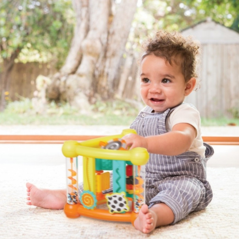 Active play centre in the shape of a triangle with many elements: different shapes, beads, knobs. Suitable for playing both indoors and outdoors. The triangular shape of the toy allows you to freely take it with you and carry it around. Each side is a different game.