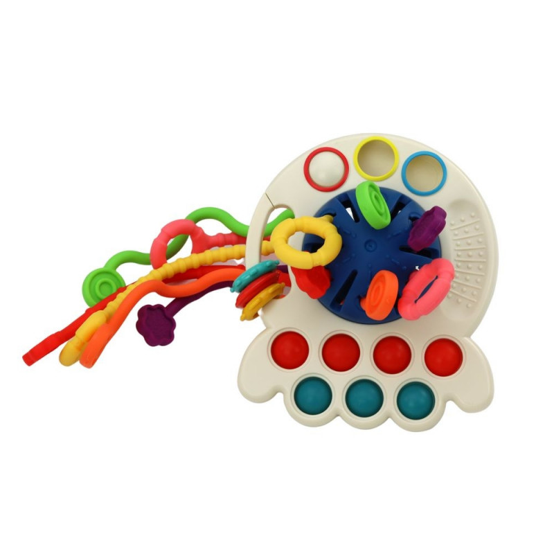 Sensoryczna ośmiornica to niezwykła interaktywna zabawka, która rozwija zmysły i umiejętności motoryczne dziecka w fascynujący sposób. Zapewniając różnorodność rozrywki, umożliwia dziecku nie tylko cieszenie się ciągnięciem kolorowych nici z jednego końca na drugi, ale także eksplorowanie możliwości wyciskania bąbelków i przesuwania koralików.