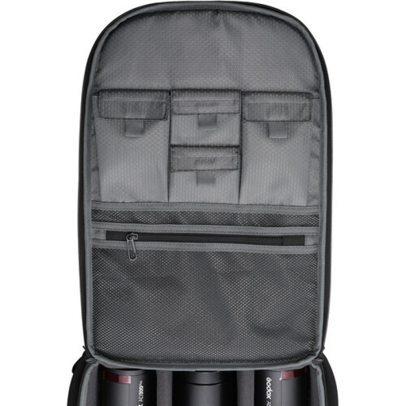 This CB20 Backpack from Godox holds two AD200, AD200Pro, AD300Pro, or AD400Pro strobe units complete with batteries, chargers, wireless remotes, and compact umbrellas for a fully portable lighting setup. Even when fully packed with the lights and accessories, the CB20 still has room to add a camera with lenses and a spacious lined pocket holds a 15" laptop or tablet.