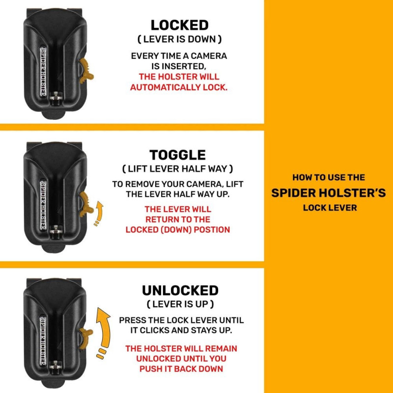 Use the camera holster lock's optional camera quick release position to draw without touching the lock switch. Great for when you need quick access to your cameras!