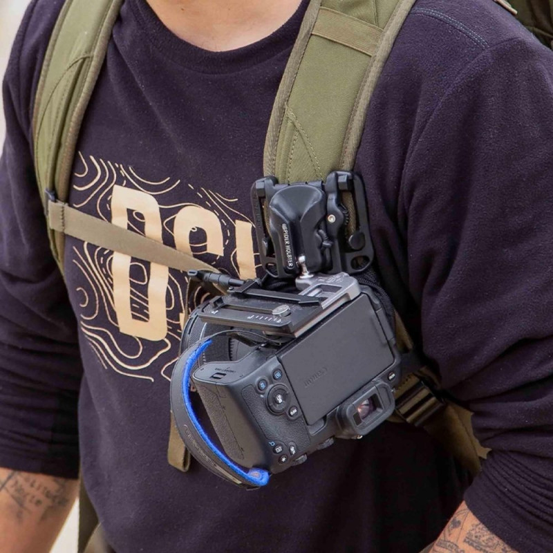 The Spider Backpack Adapter attaches securely to your backpack’s strap or loops through a casual belt. It includes a camera pad with an elastic velcro strap to stabilize the lens, minimizing bounce and preventing scratches when not in use.