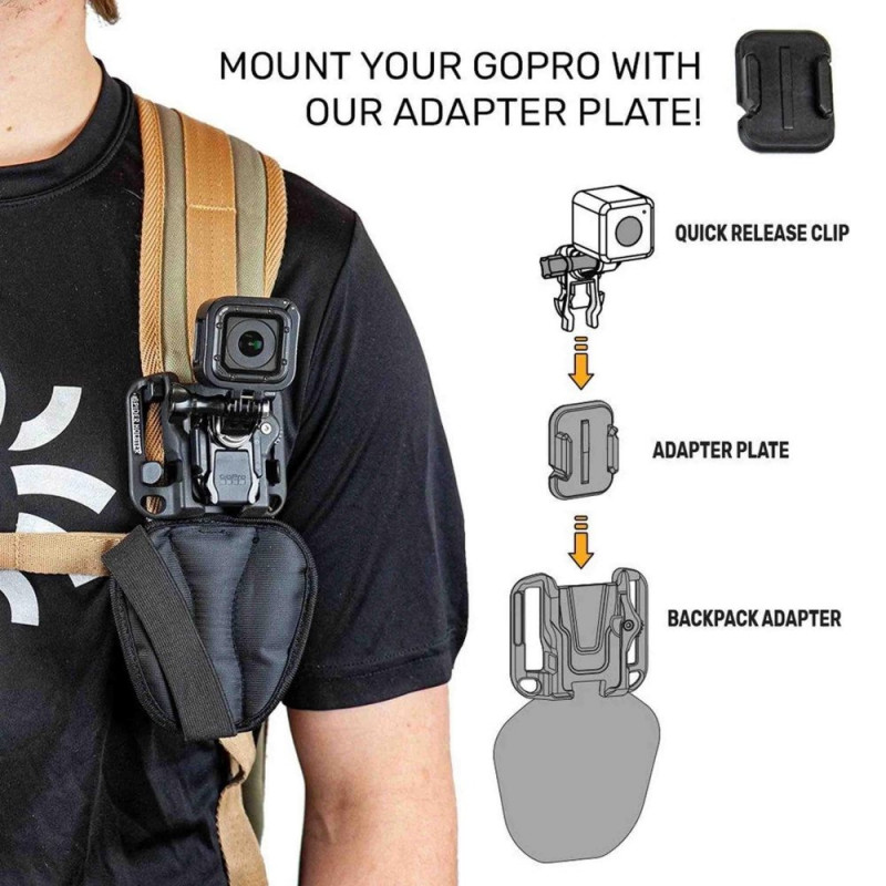 The GoPro Adapter Plate is designed to integrate with the Spider Backpack Adapter, enabling compatibility with GoPro-style brackets and camera cases.