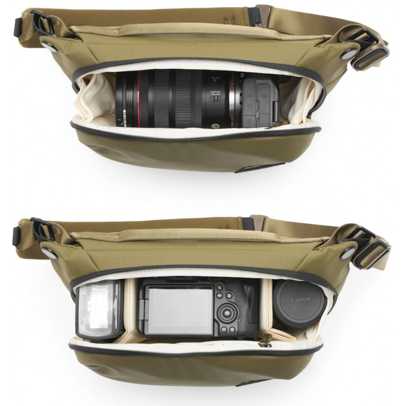 Inside, the Everyday Sling boasts a well-organized layout with customizable padded dividers. These dividers can be adjusted to fit a variety of gear, from camera equipment to personal items. The spacious main compartment allows for efficient organization and quick access to your belongings.
