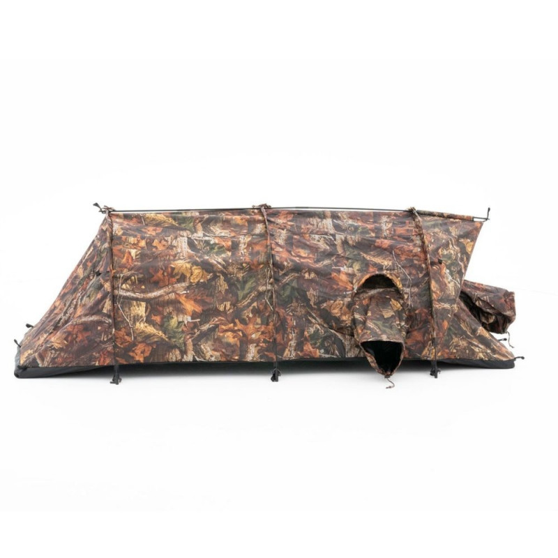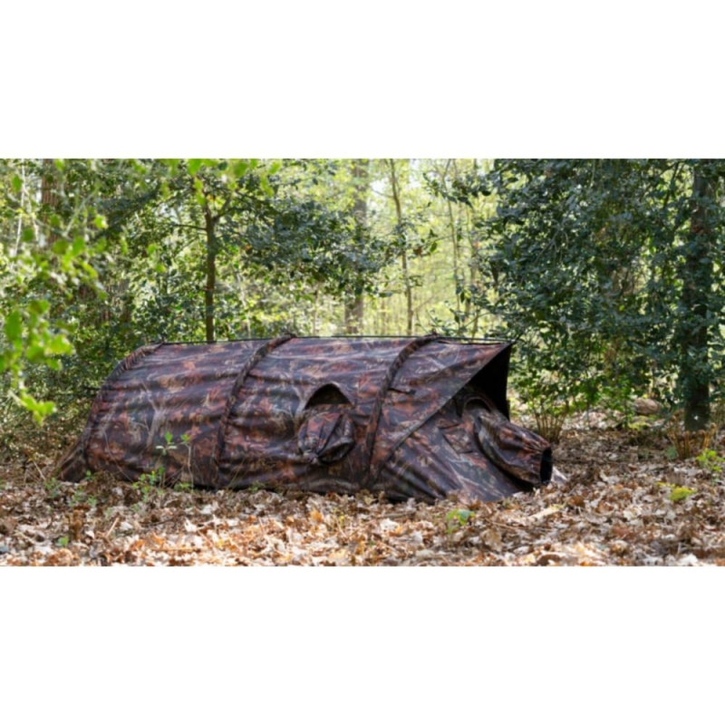 The snoots can be fastened inside and opened when needed to react quickly to movement. When leaving the tent, they stay outside so rainwater can drain off. The tent comes in three camouflage colours and suits taller people who want to lie down fully inside. You keep visibility in all directions without giving up protection.