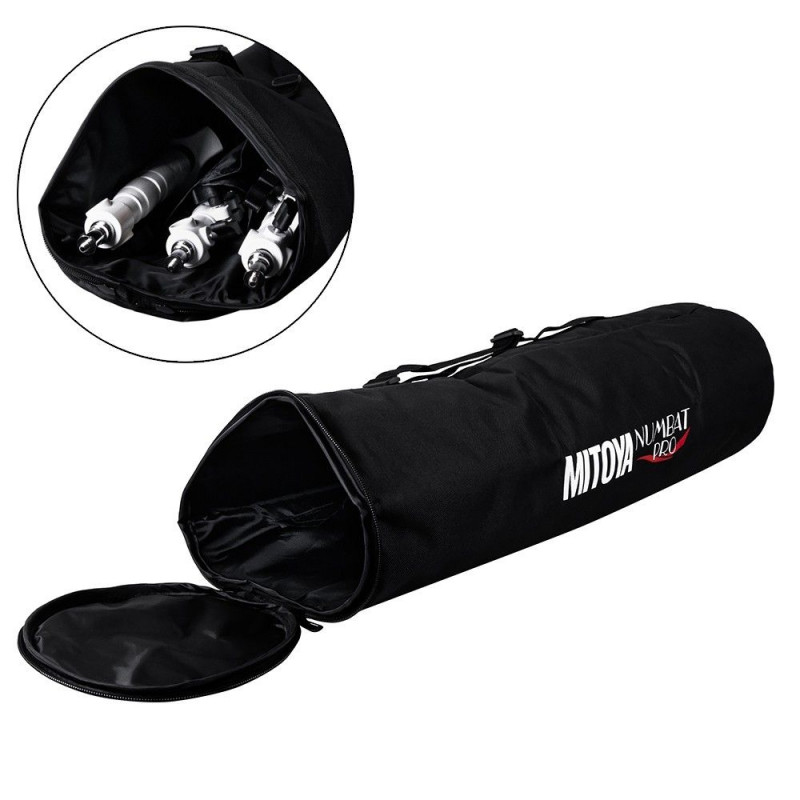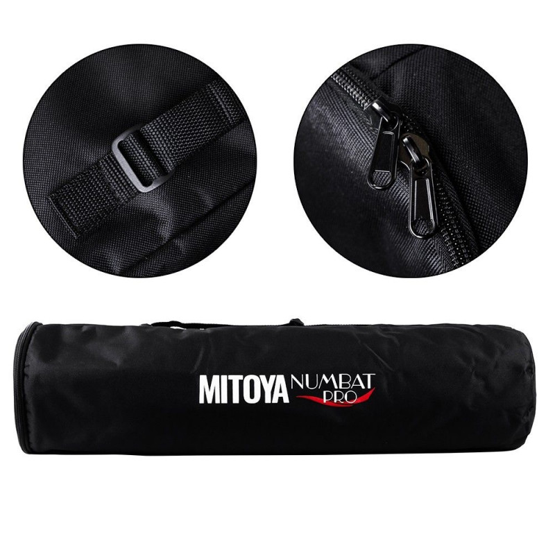 The MITOYA NUMBAT PRO is a durable nylon bag with three compartments for easy transport of studio equipment. It measures 72 × 20 × 20 cm and has a capacity of 22 liters, featuring a double zipper and adjustable shoulder strap.