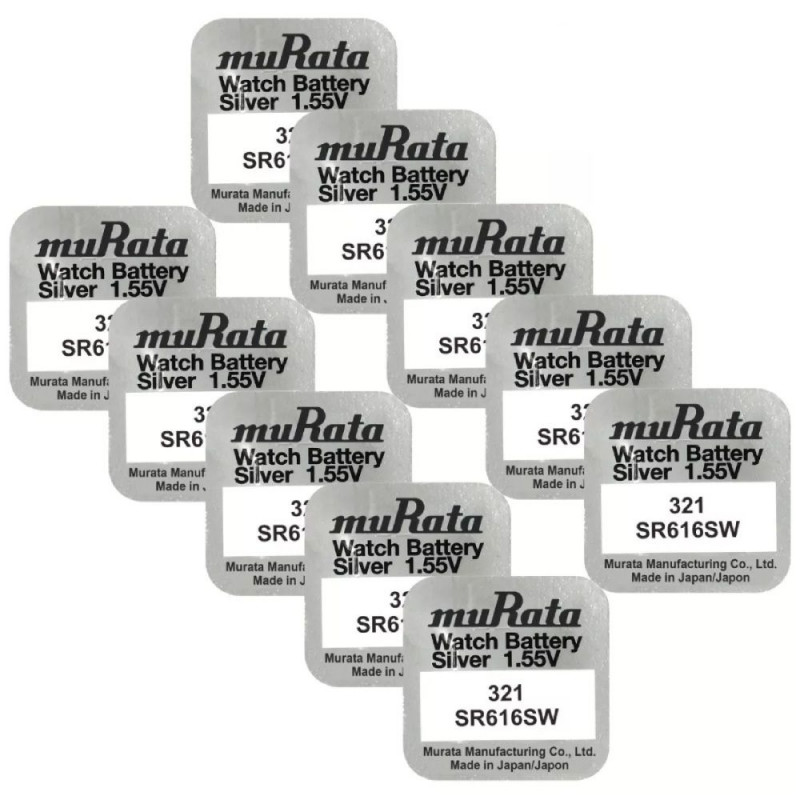 Murata 321 SR616SW silver oxide batteries are 1.55 V with dimensions of 1.65 mm x 6.8 mm. They are suitable for watches, calculators, and remote controls, and come in a pack of 10.